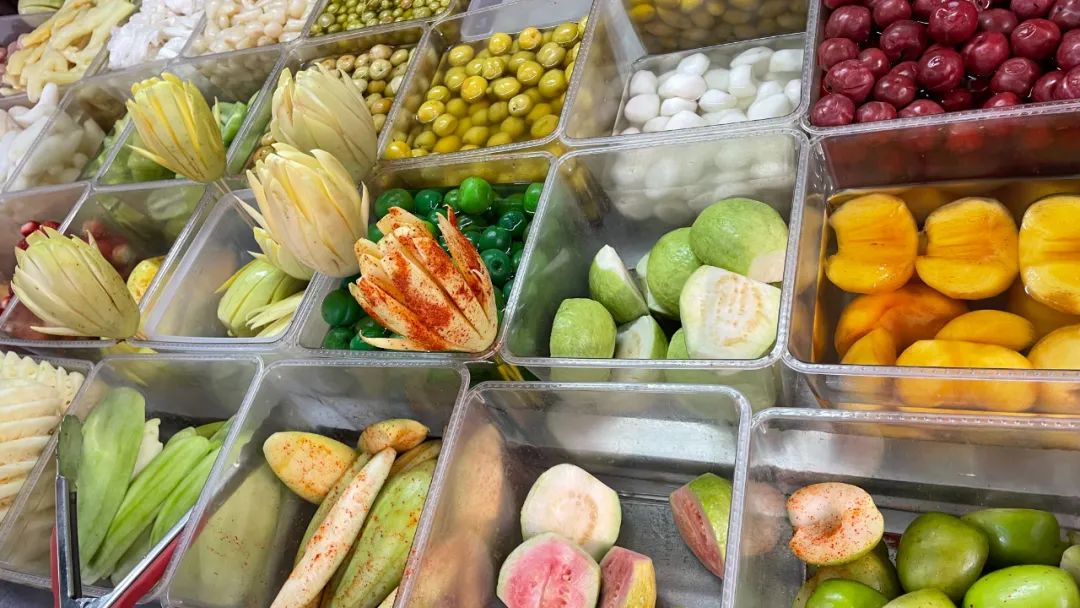 广西一直有“水果王国”之称,这也给广西人做酸嘢提供了得天独厚的食材来源,没有一颗果子能逃脱广西的酸嘢摊。