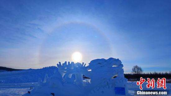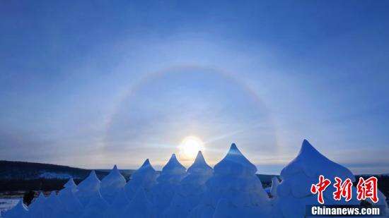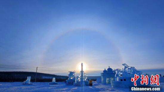 1月10日,“中国冷极”内蒙古自治区根河市上空出现日晕景观。
