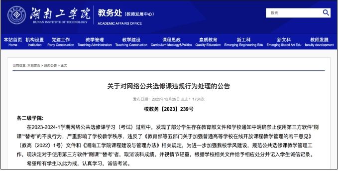 此外,《意见》表示,根据高校教学需求,及时准确提供相关高校学生学习数据。发现“刷课”“替课”“刷考”“替考”的学生,应当予以记录并通报学生所在高校,由高校按照学生管理相关规定予以处理。
