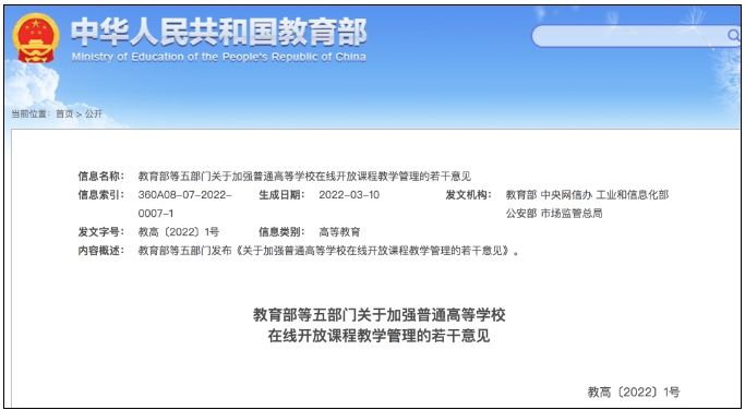 2022年,教育部网站发布了《教育部等五部门关于加强普通高等学校在线开放课程教学管理的若干意见》,明确就加强高校用以认定学分的在线开放课程教学管理提出意见。