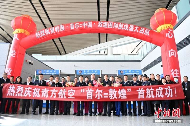 敦煌莫高国际机场工作人员庆祝韩国首尔至敦煌的航班首航成功。