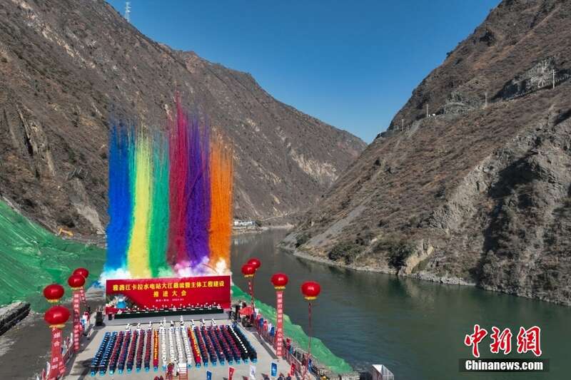 雅砻江卡拉水电站大江截流暨主体工程建设活动现场。