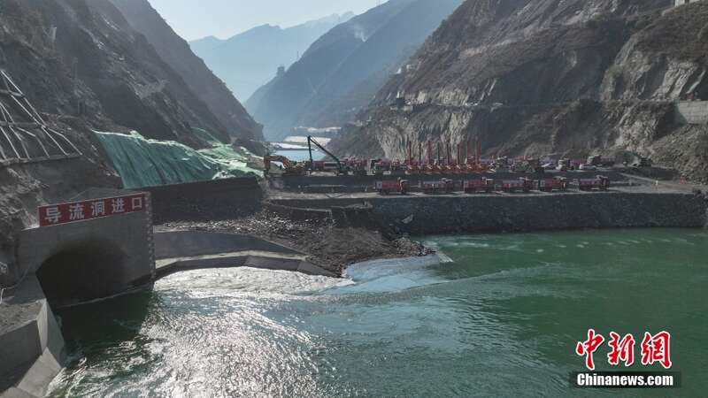 雅砻江卡拉水电站大江截流围堰已完成,导流洞过水。