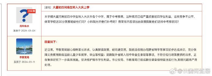 大庆市网络问政平台显示,1月4日,有网友表示,本学期大量河南初四中学生转入大庆市各个中学,属于中考移民,这种情况已经严重损害初四学生利益,这样竞争不公平,体育学校这30分就都能给他们吗?小科就允许他们补考吗?教育局不应该出台政策限制他们这样中考移民吗?