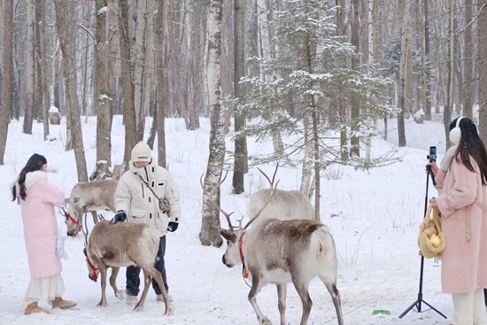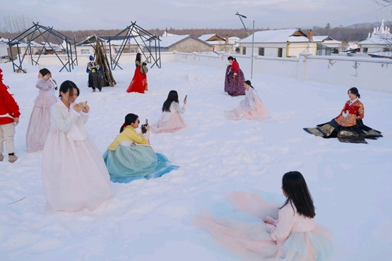 最近,很多南方游客来到位于长白山北景区附近的奶头山村民宿。在这个朝鲜族村落里,游客们穿上朝鲜族服饰跟麋鹿一起拍照、体验冬捕冰钓、在雪地里吃火锅。