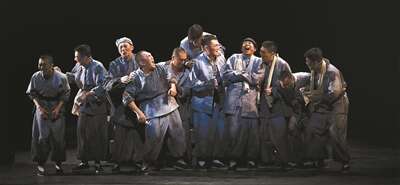 随着颇具韵律感的音乐奏响,十几条拉车的汉子从黑暗中跑出,跑成一条直线,侧台喷出的干冰包裹了他们的身影,仿佛烟尘雾霭中低头挣命的众生。这时,不辨面目的车夫们跑上舞台后椽的高处,被抬到需得仰视的主角地位。接着,灯光将他们的面孔打亮,洋溢在脸上的笑容是朝气蓬勃的。