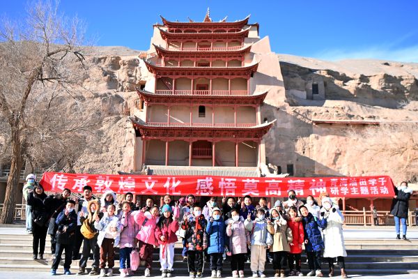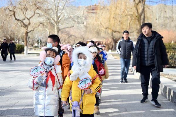 2024年1月11日,小朋友们在甘肃敦煌莫高窟景区参观。当日,青海油田教育管理中心在敦煌莫高窟举行“传承敦煌文化 感悟莫高精神”为主题的研学活动,近千名青海学子走进莫高窟感受中华优秀传统文化,深度感悟敦煌文化魅力。 中新社记者 九美旦增 摄
