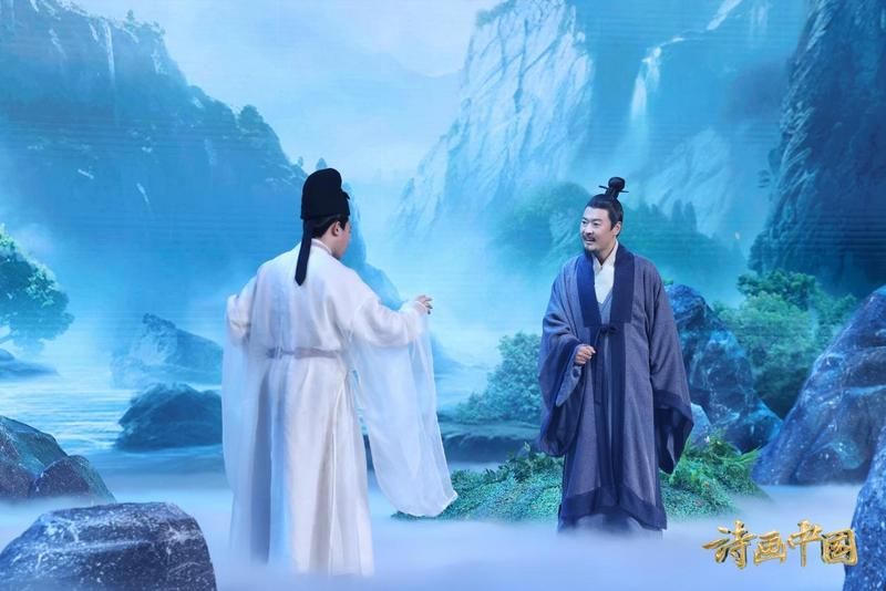歌手许嵩以歌入画,于《蜀川图》卷绘就的巴山蜀水间,唱出北宋画家李公麟寄情山水、纵览天下的旷达情怀;出生于湖北的演员曾黎,将家乡的汉江之景融入歌曲,由此引出《江汉揽胜图》轴。“从此去,黄鹤飞向,无限碧空。”婉转唱词袅袅入耳,曾黎以戏腔带观众“进入”画中景,借一位明代仕女之口,还原昔日武汉三镇的繁荣景象;演员张桐一人分饰李白、苏轼、沈周三角,演绎《庐山高图》轴创作背后的故事。