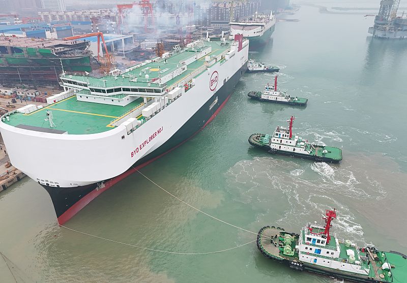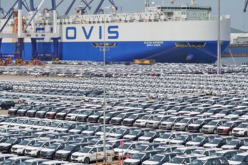 2023年12月13日,苏州港太仓港区国际集装箱码头,一批新能源汽车即将通过专用框架运输方式出口。