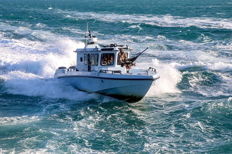 当地时间2023年12月12日,红海海域,也门海岸警卫队成员乘坐快艇在也门塔伊兹省莫卡镇附近的红海上巡航,该镇靠近具有战略意义的曼德海峡。
