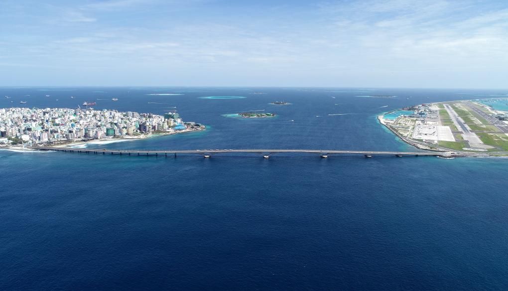 在千岛之国马尔代夫,桥一直承载着人们对美好生活的期盼。如今,一座壮观的大桥飞跨海面之上,连接着首都马累和机场岛。桥下碧波万顷,桥上车水马龙。两侧的人行道上,不时有行人驻足留影。航班起飞或降落之时,俯瞰海面,这座全长2000米的大桥最为引人注目。