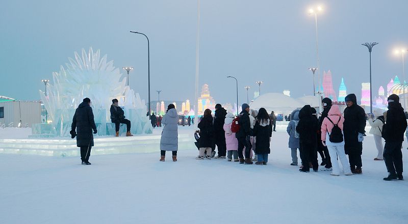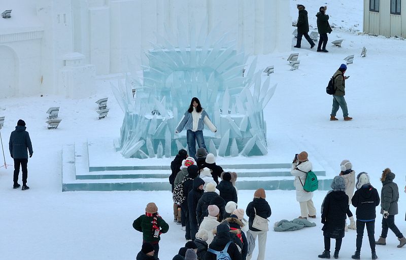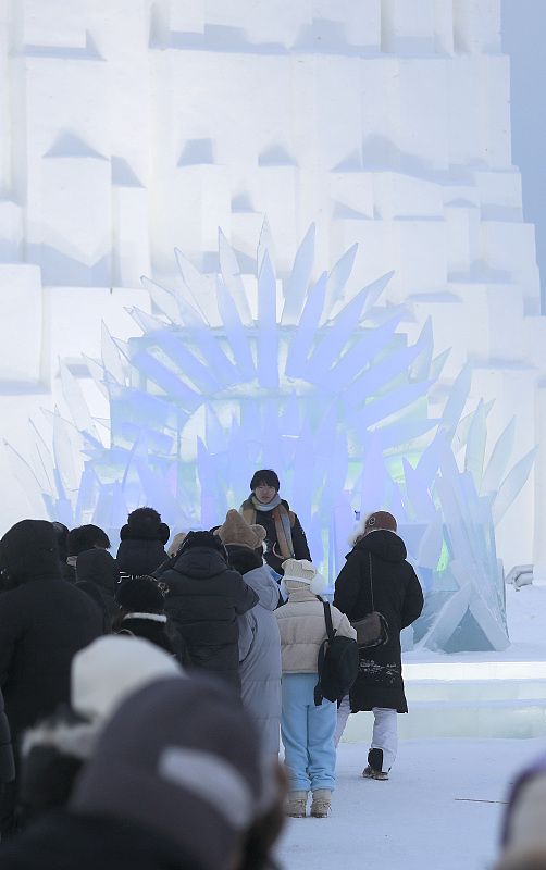 2024年1月12日,哈尔滨,冰雪大世界的“铁王座”已连夜建成,一座由冰制作的插满冰剑的王座成为权游迷们的心头好,每天,“铁王座”前都排出长长的队伍。