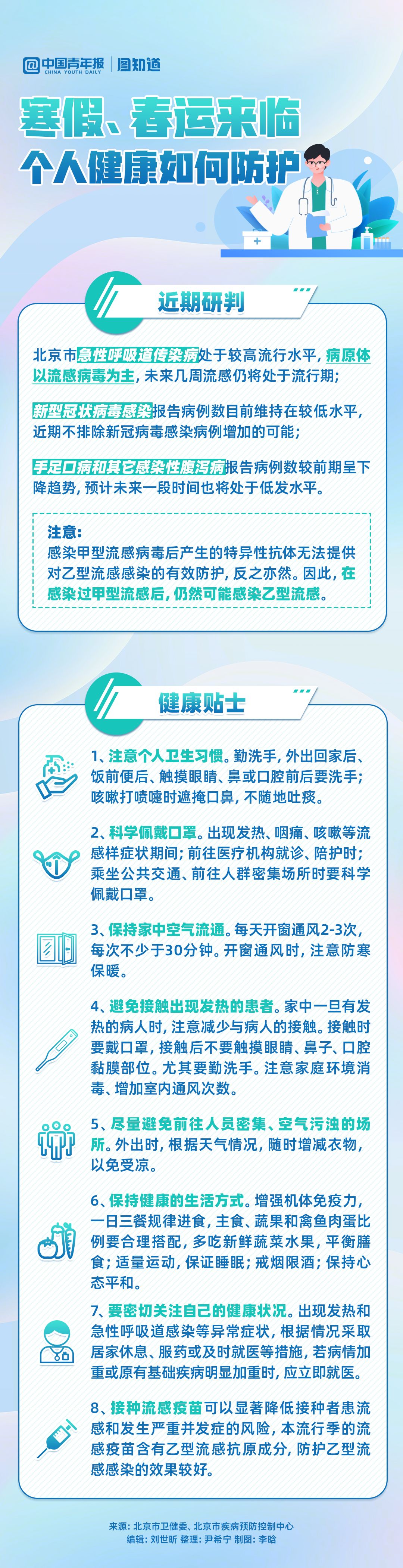 冬季,呼吸道疾病多发,寒假、春运带来人员流动,多地卫健、疾控部门提示公众要做好健康防护。北京市疾控中心近期就研判称,未来几周流感仍处于流行期。放假、回家过年期间,对照这份健康小贴士,过个平安健康年。