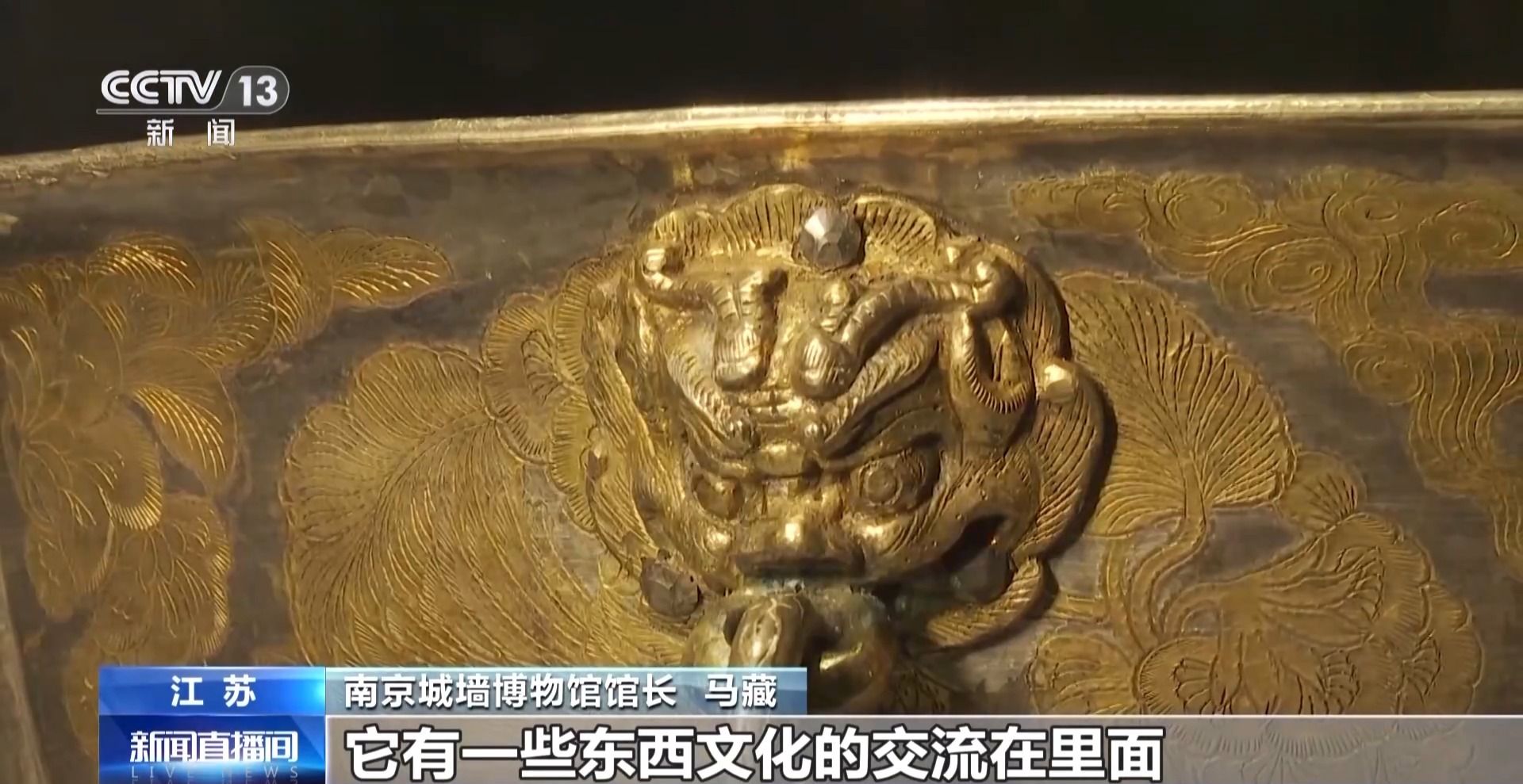 南京城墙博物馆馆长马藏:这次展出的文物里面有一件鸳鸯银镏金的大银盆,主体是银的,上面的鸳鸯纹饰是做鎏金处理。包括铸造、錾刻、捶揲、铆接,它是多种工艺铸造的一件精品文物,它有东西方文化交流在里面,反映了唐代兼容并蓄、包容的环境。