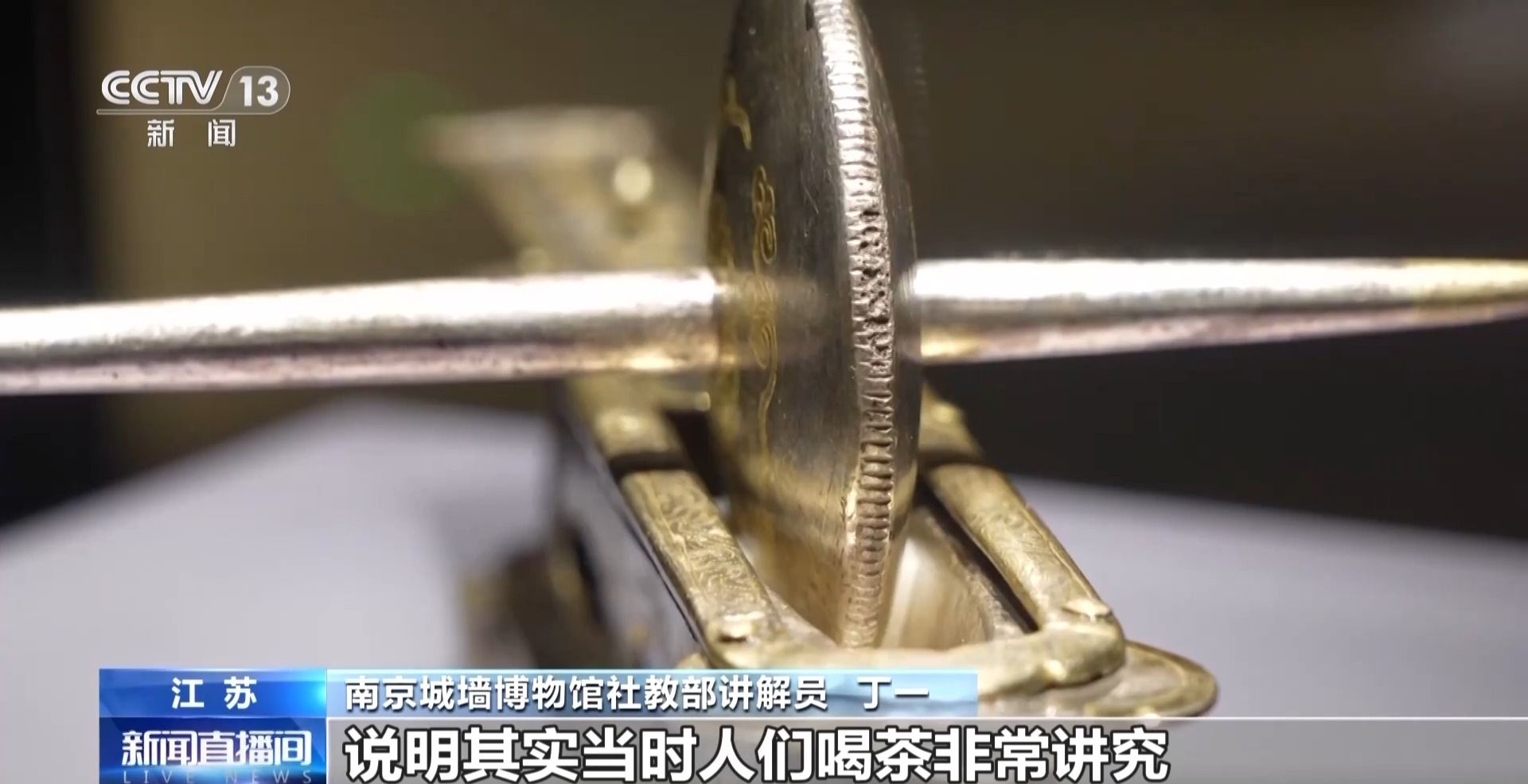 南京城墙博物馆社教部讲解员 丁一:下方是茶碾,上方是砣轴,在中间放上茶叶,把它碾碎,这个茶末就可以冲泡茶了。说明当时人们喝茶非常讲究,而且非常风雅。