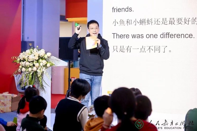 第二场活动“人教爱阅 快乐成长——人教少儿英语分级绘本故事分享会”,由人教社英语编辑室于佳名和汤慧带来。两位老师以小课堂的形式,绘声绘色地讲述了人教社“爱阅英语”系列绘本中“小鱼和小蝌蚪”的故事,带领现场的小朋友们一起学单词。