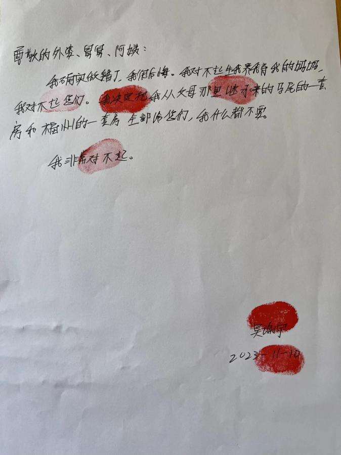 郑晓静谈到,她在2023年11月10日曾到福州市第一看守所会见吴谢宇。吴谢宇在当日所写的道歉信中称:“尊敬的外婆、舅舅、阿姨,我确实做错了,我很后悔。我对不起生我养我育我的妈妈,我对不起您们。我决定把我从父母那里继承来的马尾的一套房和福州的一套房全部给您们,我什么都不要。我非常对不起。”