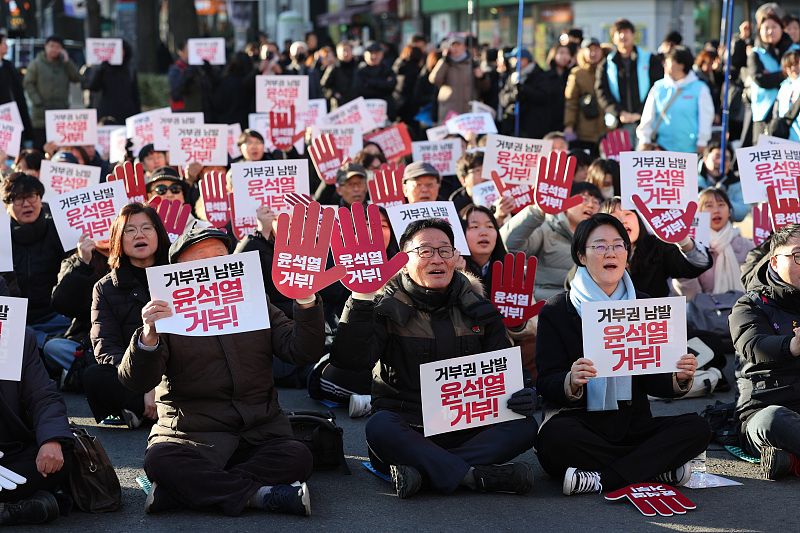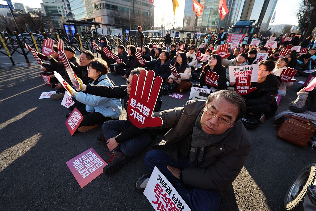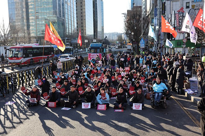 据韩联社报道,韩国84个民间团体组成的“拒绝否决权全国紧急行动”组织当地时间2024年1月13日在韩国首尔光化门广场附近集会,抗议总统尹锡悦对涉及其夫人的《金建希特检法》和《大庄洞50亿俱乐部特检法》(即所谓的“双特检法”)行使否决权。