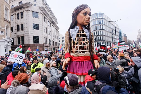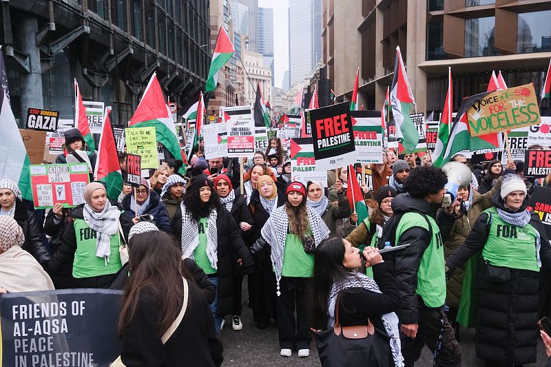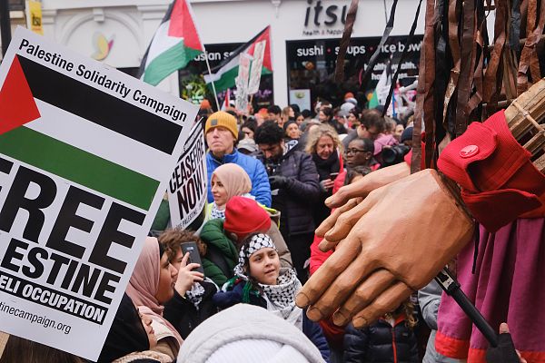当地时间2024年1月13日,英国伦敦,市民在市中心参加支持巴勒斯坦的抗议游行。