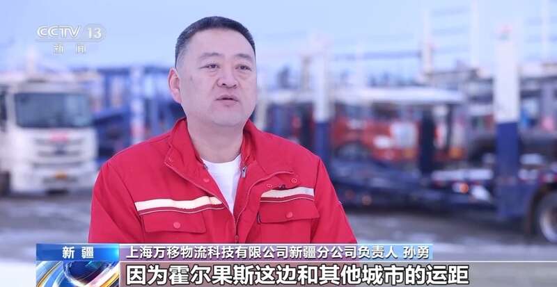 上海万移物流科技有限公司新疆分公司负责人 孙勇:机动车的运输现在整体全部转到公路上,因为霍尔果斯这边和其他城市的运距是比较短的,离最近的阿拉木图不到400公里的运距,半天的时间可以到哈(哈萨克斯坦)方。