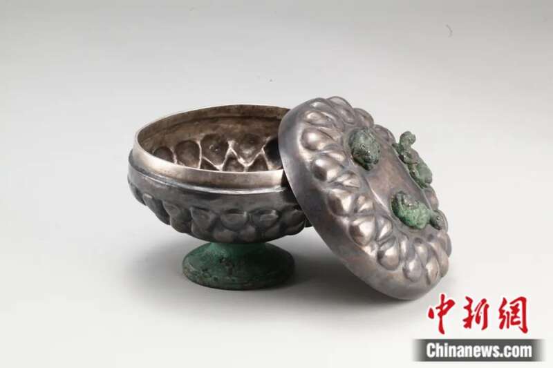 王晓莲:银豆的主体为银器,子母口带盖,平盖微弧,顶置三个铜制兽形钮。豆盘浅腹内收,小平底,下接铜制矮圈足,器身及盖面均锤揲两圈尖瓣形凸泡饰,尖端相对,交错排列,简洁大方。