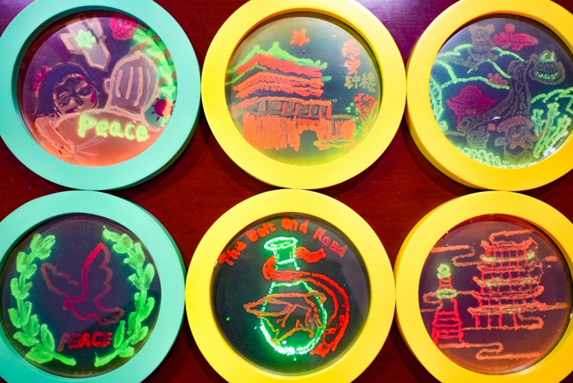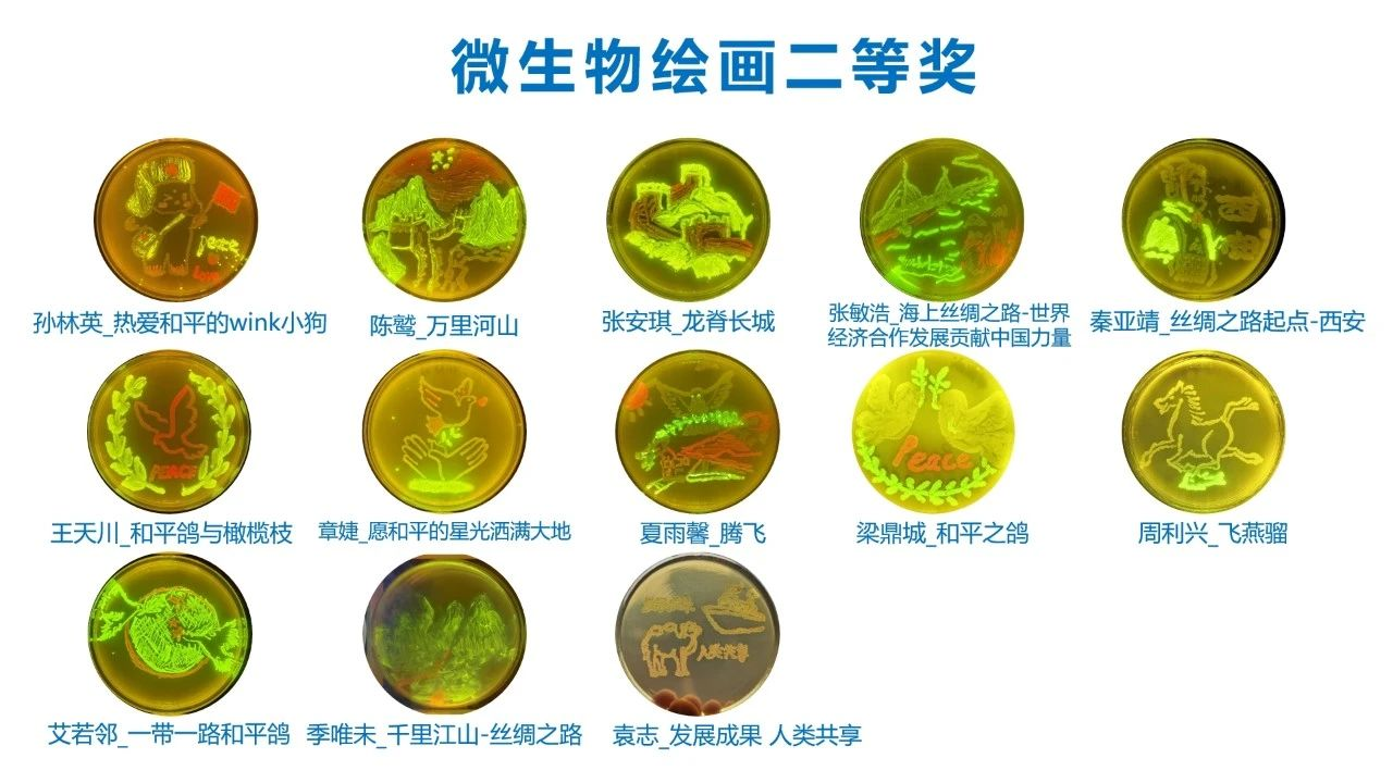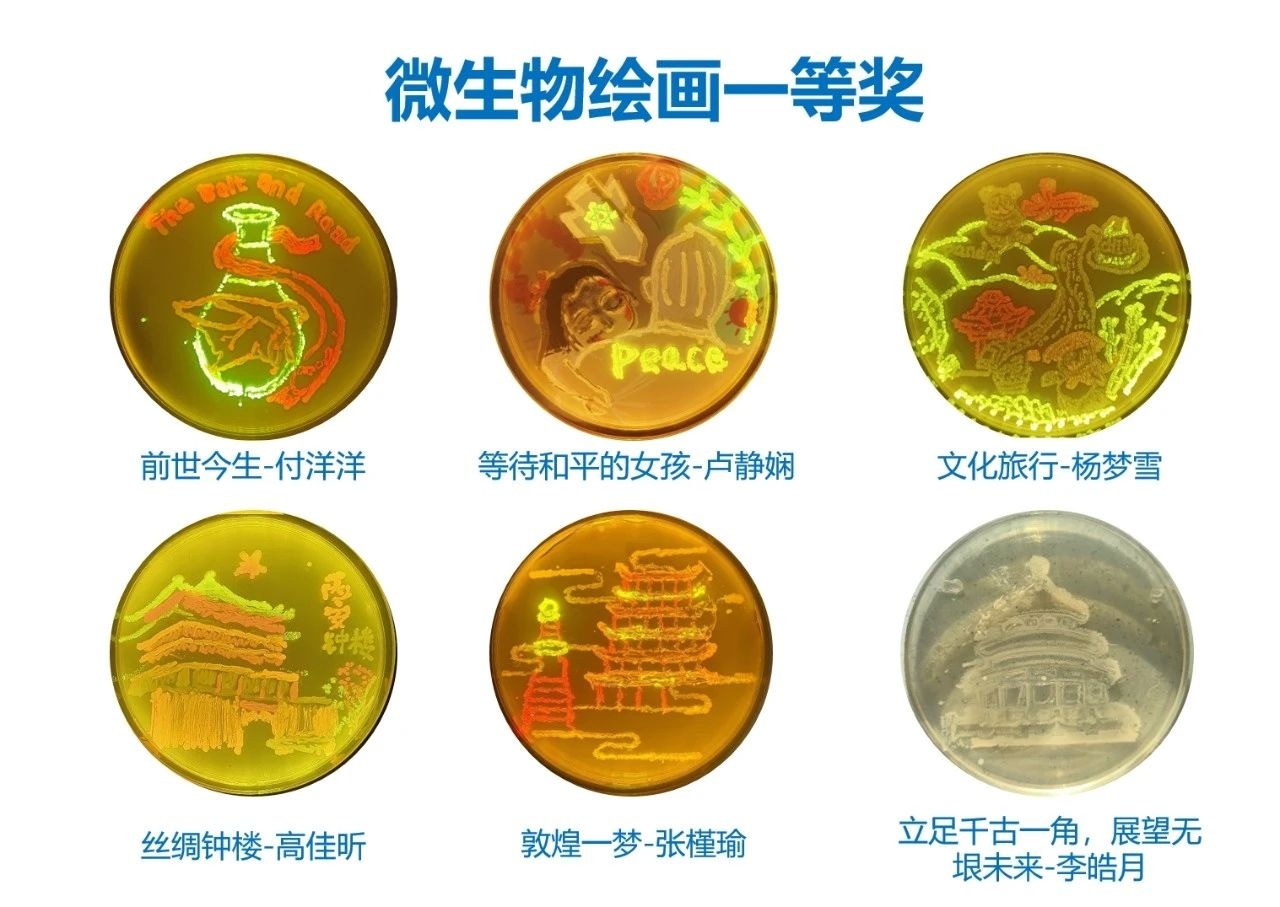 今年“微生物学实验”的期末考试,还以“微生物艺术创作大赛”的形式,邀请到河北工业大学、南开大学、天津科技大学等学校的同学一起参加,别出心裁地设置了三个赛道:微生物绘画、显微摄影和短视频。2023年,是“一带一路”倡议提出10周年,微生物艺术创作大赛也以“和平发展,世界共荣”为主题,将科学与美育相结合,厚植爱国主义情怀。