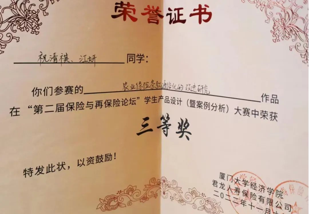 功崇惟志,知本勤学。研究生入学以来,江妍同学认真学习专业知识,在研一上学期期末考试中多门专业课成绩突出,排名约占前10%,并积极参与学术比赛,2022年11月参加第二届保险与再保险论坛产品设计竞赛获得三等奖。本科期间参加2019年、2020年美国数学建模大赛获得了Honorable Mention的荣誉,专业综合排名专业前20%,屡次获得综合奖学金。