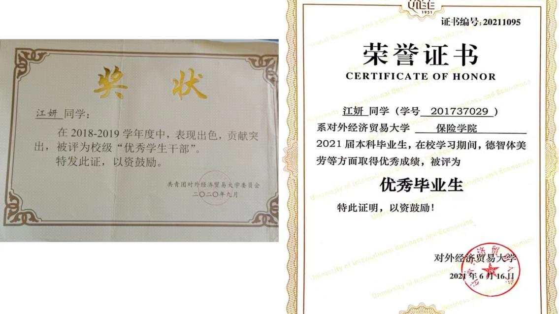 全面发展,德才兼备。 本科期间江妍同学担任本科生辅导员助理,协助辅导员老师处理毕业年级日常工作,充分发挥学生身份,及时准确了解学生的学习、生活、工作和心理、思想动态,关心需要帮助的同学,协助辅导员开展年级日常管理和思想政治教育。江妍同学在任职分团委学生会主席期间,策划参与的学生活动累计100余场,活动参与人次突破5000人次,曾带领并组织分团委相关部门参加校级比赛,屡获佳绩,例:在戏剧节比赛、服饰风尚大赛以及风采嘉年华中都获得了第一名的成绩。作为第一负责人筹备了市级保险广告设计大赛,覆盖了北京十余所高校,收到了来自不同学校不同年级百余份作品,获得了同学们较高的反响,同时也获得了 2020年校级优秀学生干部荣誉。