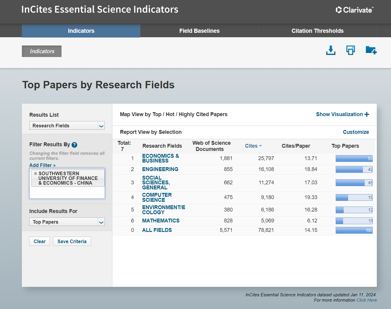 据基本科学指标数据库(Essential Science Indicators,简称ESI)1月11日发布的最新数据显示,西南财经大学数学学科进入ESI全球前1%学科行列,成为学校继“经济学与商学”“工程学”“社会科学总论”“计算机科学”“环境生态学”之后第六个进入ESI全球前1%的学科。