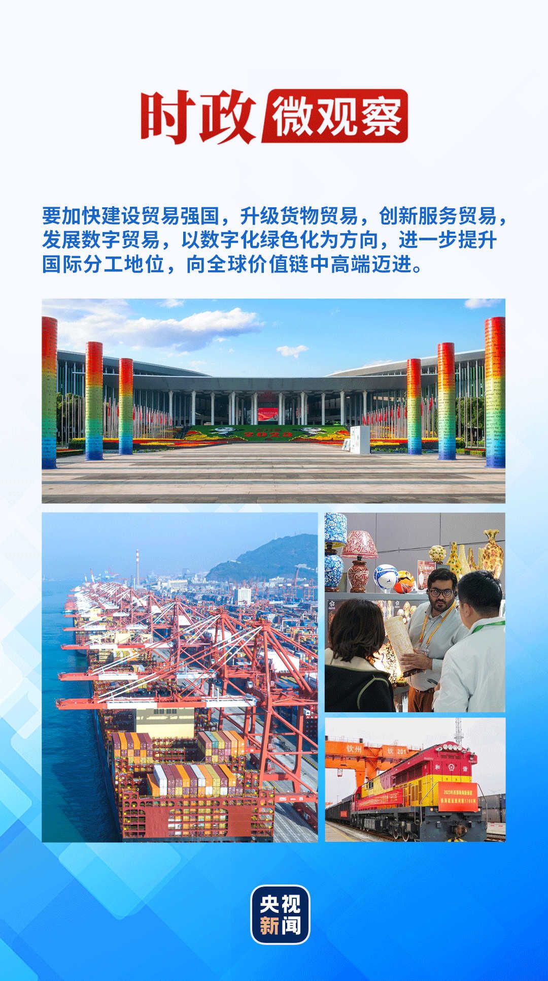 习近平总书记强调:“要加快建设贸易强国,升级货物贸易,创新服务贸易,发展数字贸易,以数字化绿色化为方向,进一步提升国际分工地位,向全球价值链中高端迈进。”