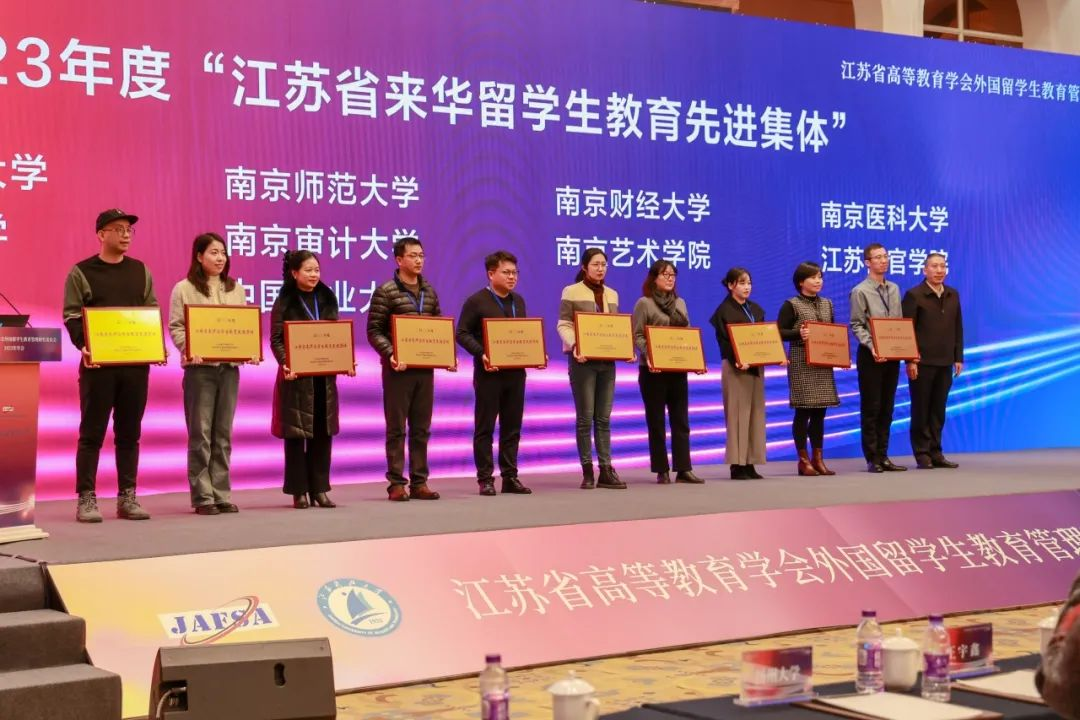 近日,江苏省高等教育学会外国留学生教育管理研究委员会2023年年会在镇江召开,来自省内近百所院校,两百多名外国留学生工作负责人和管理人员参加了会议。我校荣获2023年度江苏省来华留学生教育先进集体,留学生院张吟和谢艺两位老师分别荣获“江苏省外国留学生教育管理先进个人”和“江苏省优秀留学生辅导员”称号。