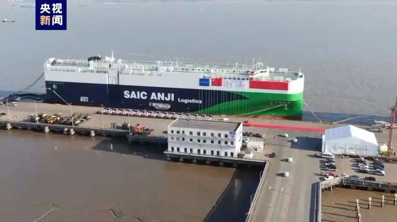这艘清洁能源汽车滚装船正式定名为“上汽安吉申诚号”。据了解,该船在上海港装船后,还将抵达国内各港口,一共搭载近5000辆中国自主品牌新车驶向欧洲,其中约有一半是新能源汽车。