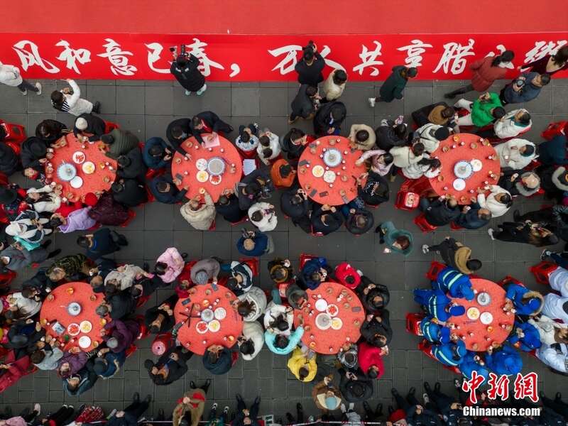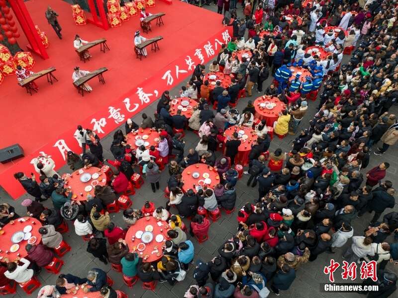 1月18日,农历腊月初八,四川阆中古城举行万人同品腊八粥活动,开启“阆中古城过大年”暨2024落下闳春节文化活动。图为游客品尝腊八粥。(无人机照片)