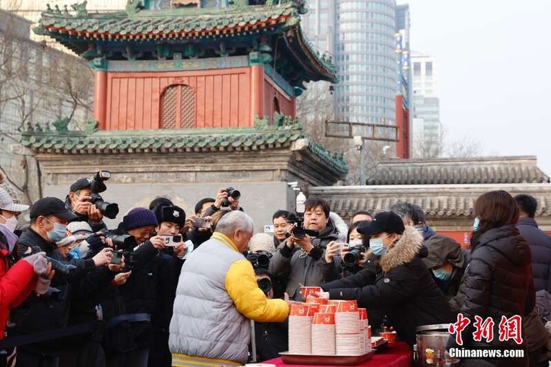 1月18日,农历腊月初八,人们在北京东岳庙门前排起长队领取腊八粥。当日迎来中国传统“腊八节”,吃腊八粥是腊八节的重要习俗。
