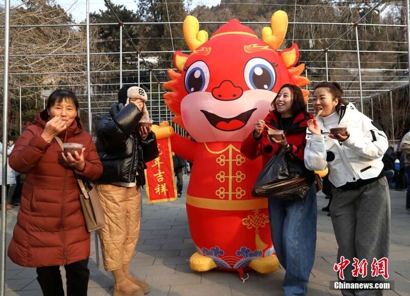 1月18日,北京千年古刹潭柘寺在帝王树广场开展“布施舍粥”活动。图为市民在龙年装饰前喝腊八粥。