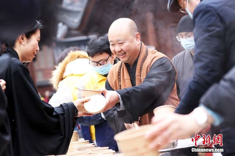1月18日,上海玉佛禅寺方丈觉醒法师向民众赠粥送福。当日,上海百年古刹玉佛禅寺在大雄宝殿前广场举行“共享浓浓腊八粥,温暖吉祥迎新年”腊八赠粥活动。从2009年开始,玉佛禅寺每年腊八节都会免费施粥。