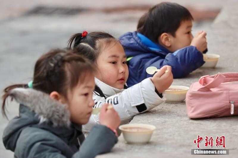 1月18日,农历腊月初八,民众在北京雍和宫领取腊八粥。当日迎来中国传统“腊八节”,吃腊八粥是腊八节的重要习俗。图为小朋友们一起喝粥。