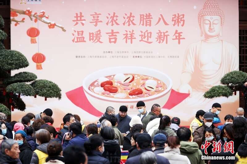 1月18日,上海百年古刹玉佛禅寺在大雄宝殿前广场举行“共享浓浓腊八粥,温暖吉祥迎新年”腊八赠粥活动。从2009年开始,玉佛禅寺每年腊八节都会免费施粥。