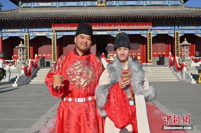 1月18日,在长春文庙内,身着古风服饰的人们展示领到的腊八粥。当日,长春文庙举行腊八节赠粥、民俗讲座、敲钟祈福、拓印福字等系列活动,吸引众多民众前来参加。