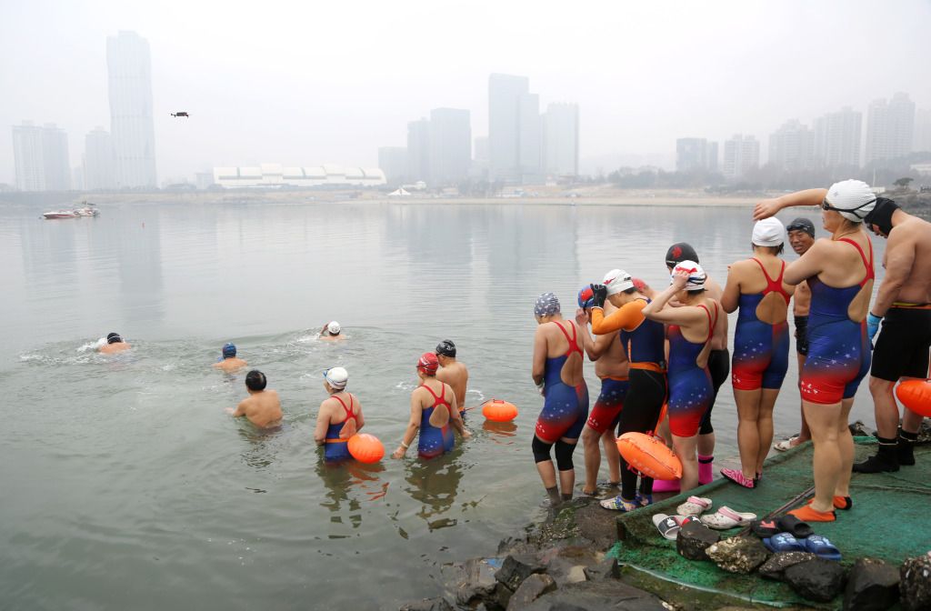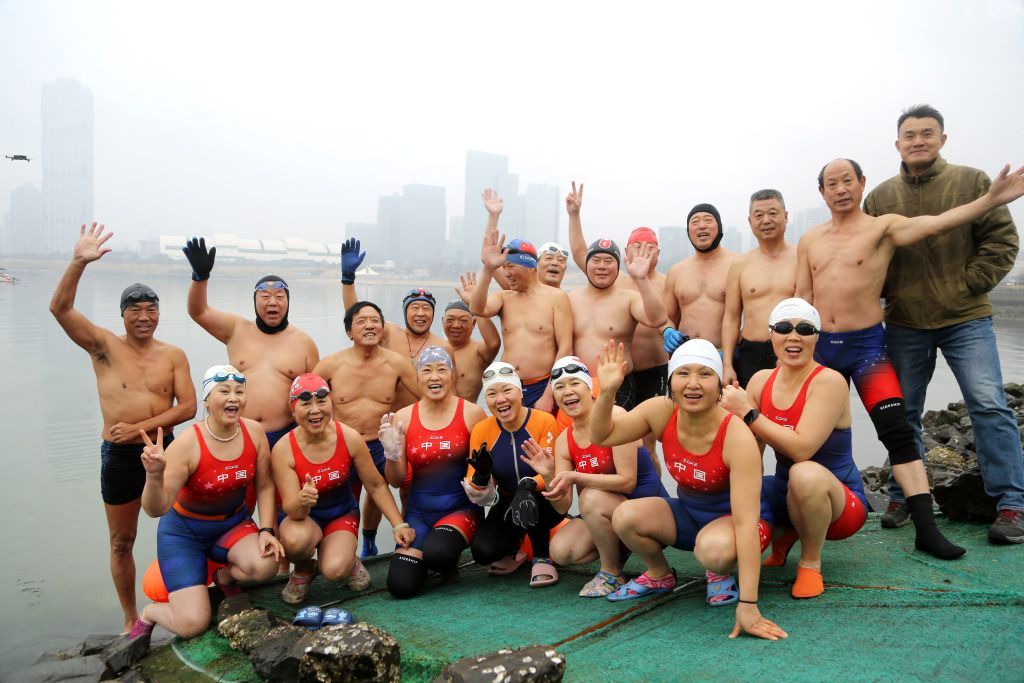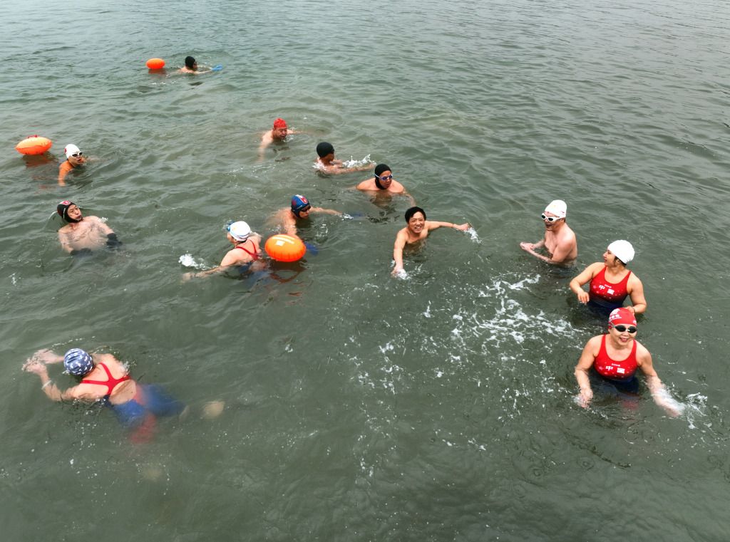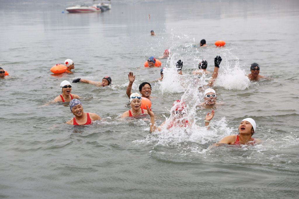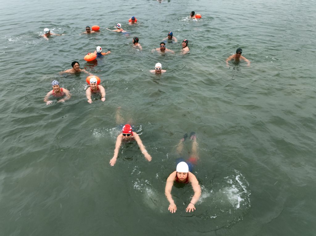 2024年1月20日,江苏连云港,大寒节气,冬泳爱好者在海上进行冬泳。