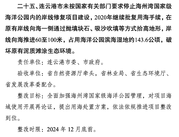 2023年2月,江苏省公开第二轮中央生态环境保护督察整改方案及整改任务清单,认定案涉项目违法在原有岸线向海一侧通过抛填块石、吸沙吹填等方式抬高地形,岸线向海推进60至100米,占用海洋公园滨海湿地约143.6公顷,破坏原有泥质滩涂生态环境。