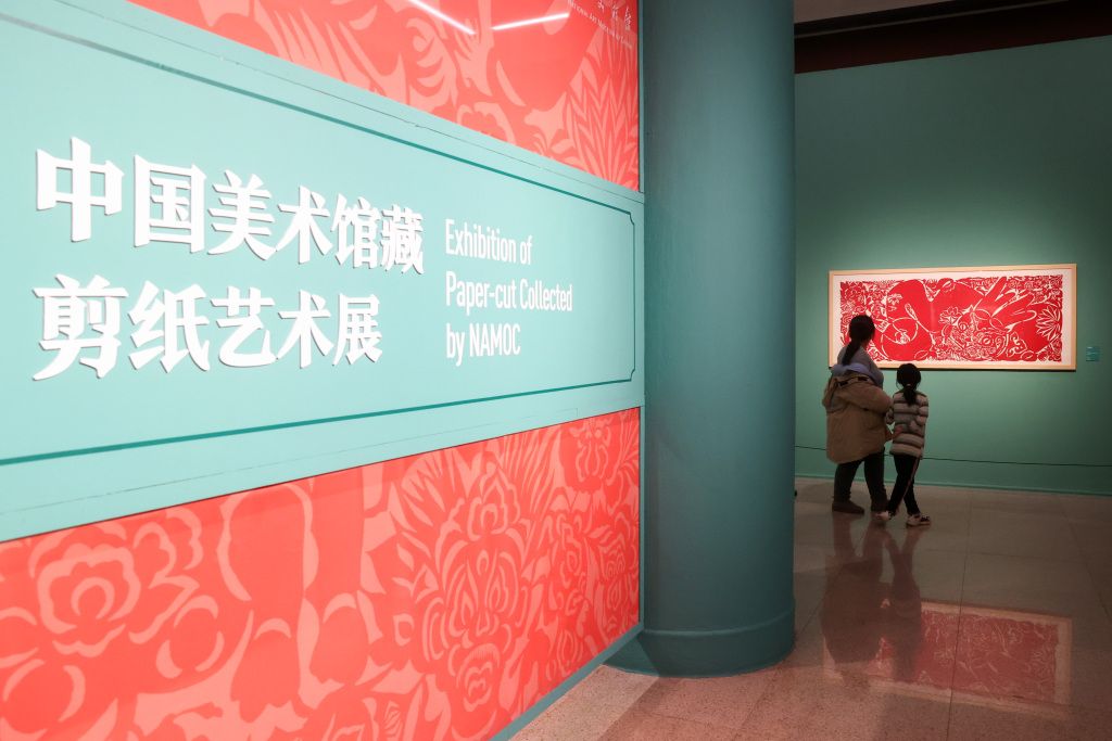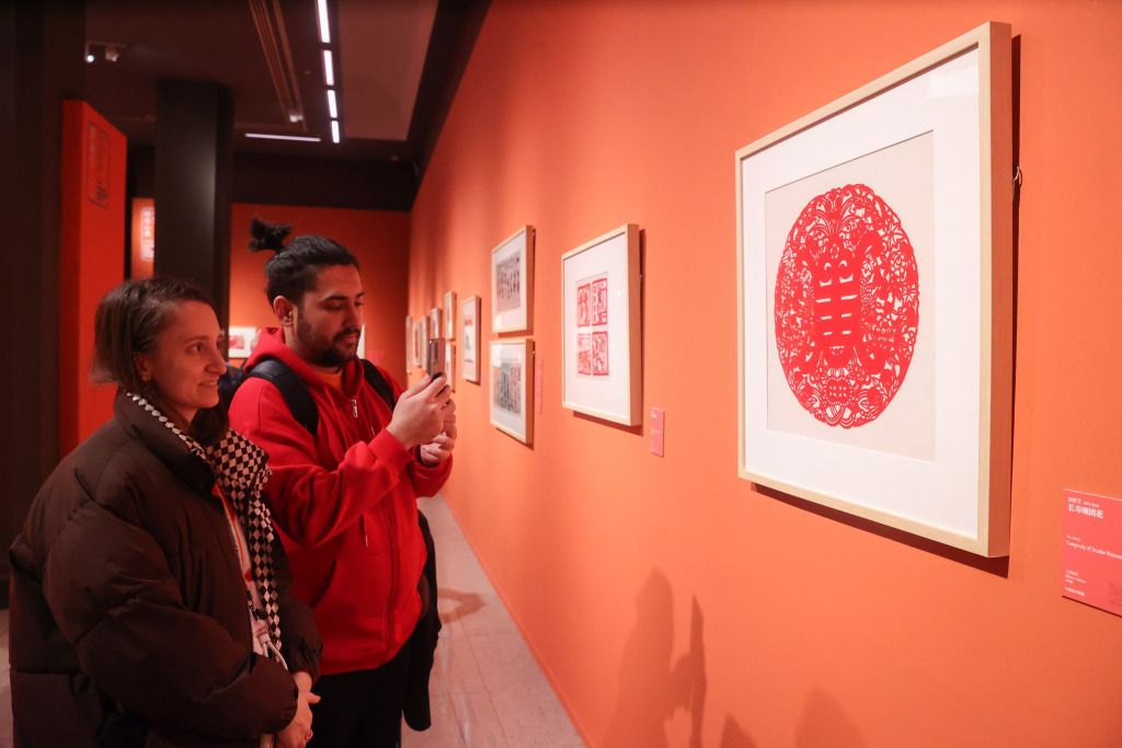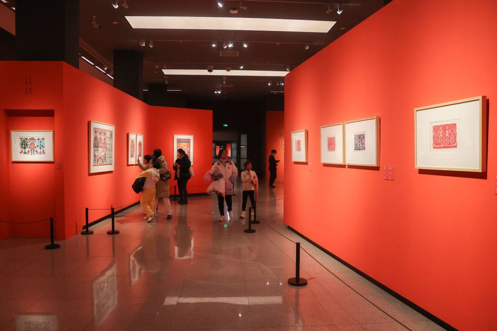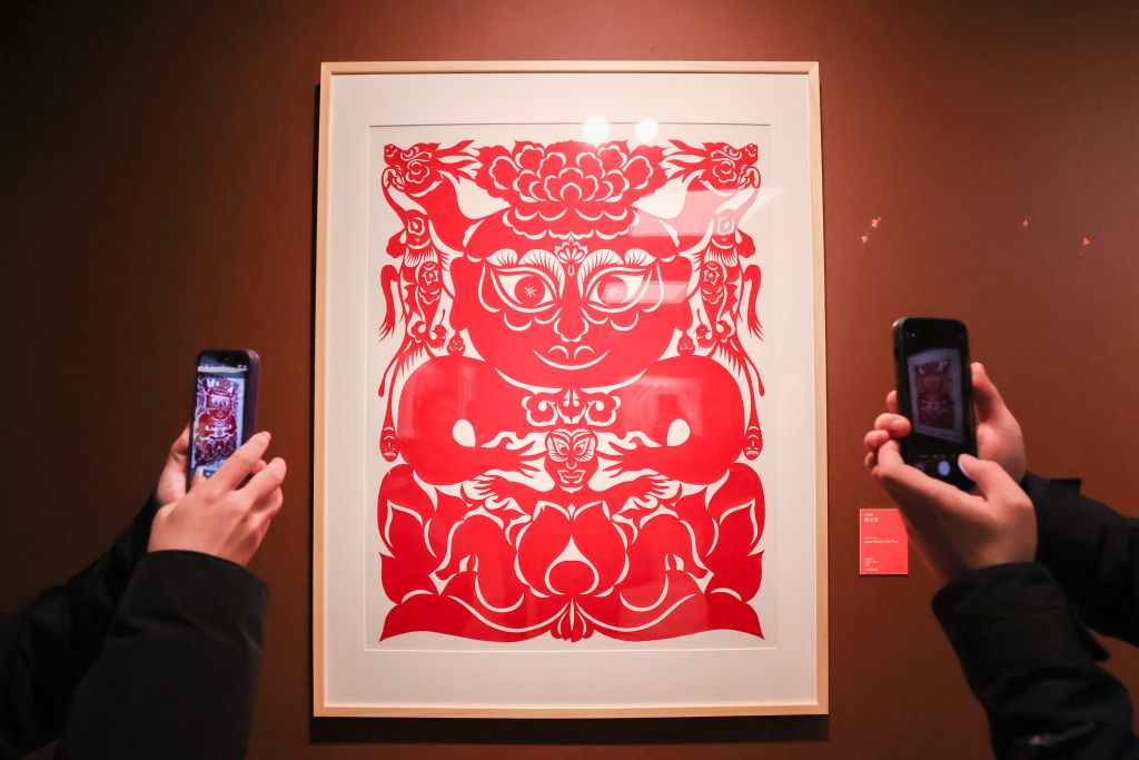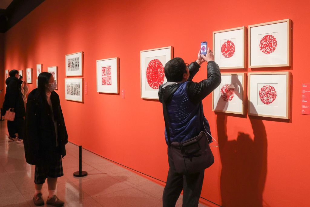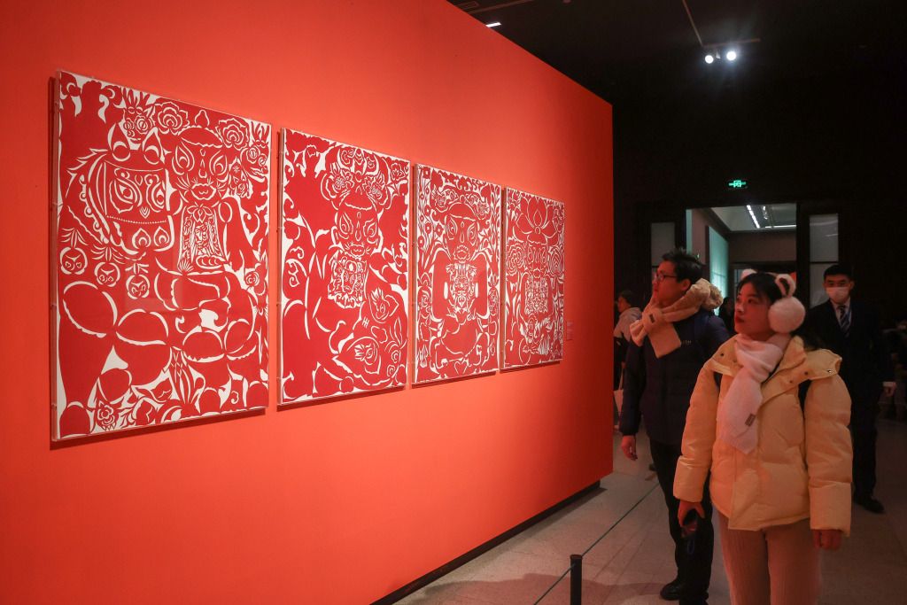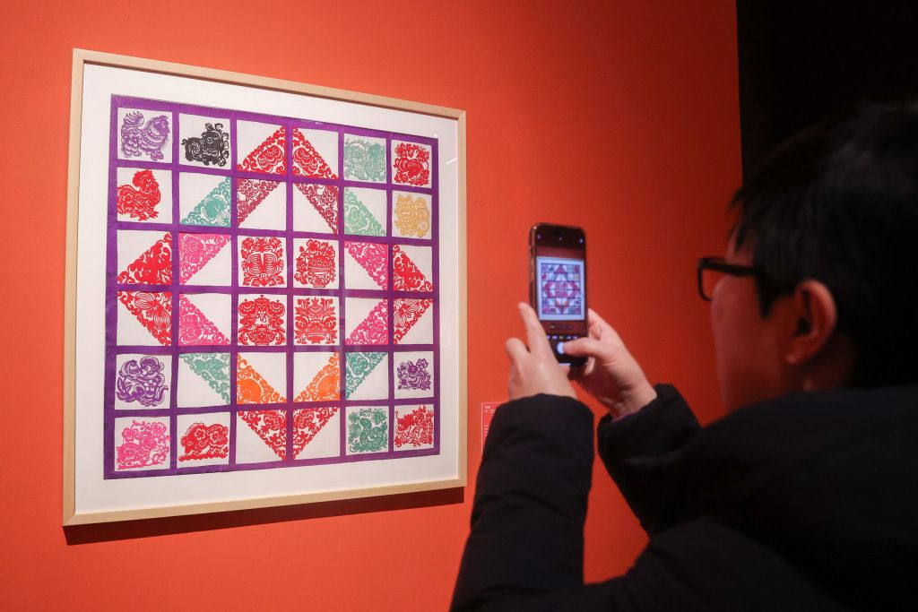 2024年1月19日,北京,观众在中国美术馆拍摄馆藏剪纸艺术展。