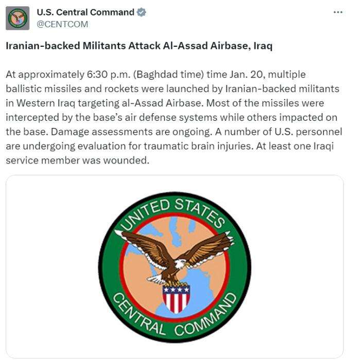 据报道,美国中央司令部在一份声明中称,伊朗支持的武装分子20日在伊拉克西部,向阿萨德空军基地发射了多枚弹道导弹和火箭弹,其中大部分导弹被基地的防空系统拦截,其他则击中了基地。
