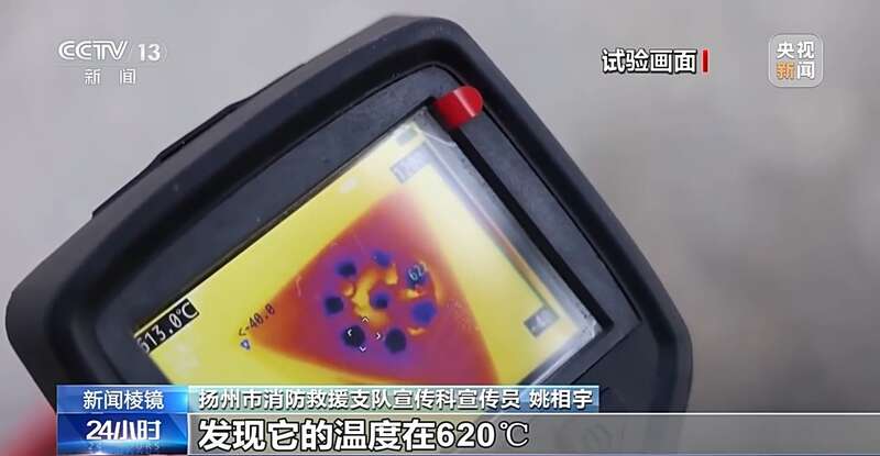 扬州市消防救援支队宣传科宣传员姚相宇:好,现在烟花已经点燃,开始燃放瞬间的温度是超过了150℃,现在数值已经达到了600多℃。现在烟花已经燃放完毕,但是我们用热成像仪对它进行测量,发现它的温度在620℃,内部的温度可以说是非常高。那么此时如果把烟花放到一些易燃可燃物的旁边,有可能会把周边的这些可燃物点燃。