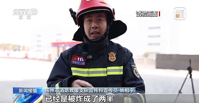 扬州市消防救援支队宣传科宣传员姚相宇:这个鞭炮放在里面之后,把它炸飞,高到已经比我们这个营房的楼还要高,而且我们看到这一个金属制的碗,已经是被炸成了两半。