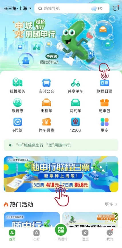 △登陆“随申行”App或微信小程序,进入“联程日票”