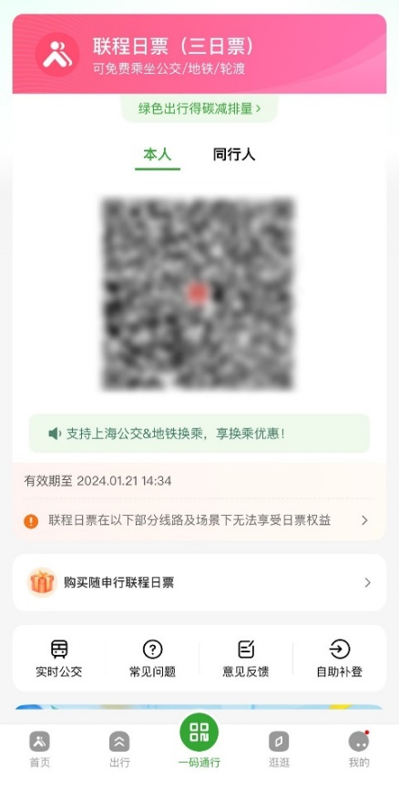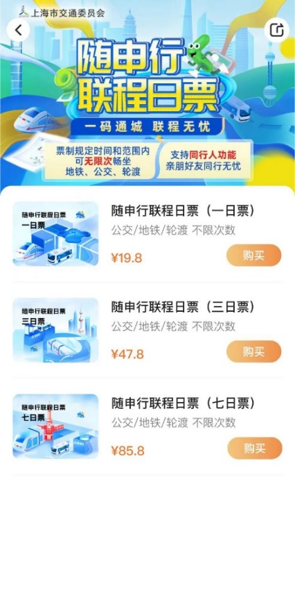 即日起,登录上海市绿色出行一体化平台“随申行”App或微信小程序,购买并启用“联程日票”,即可在有效时间内不限次乘坐上海地铁、公交和轮渡。没有智能手机的老人和儿童可以通过“随申行”平台上的同行人乘车服务,请家人代为购买,支持一日票、三日票、七日票等全票种。