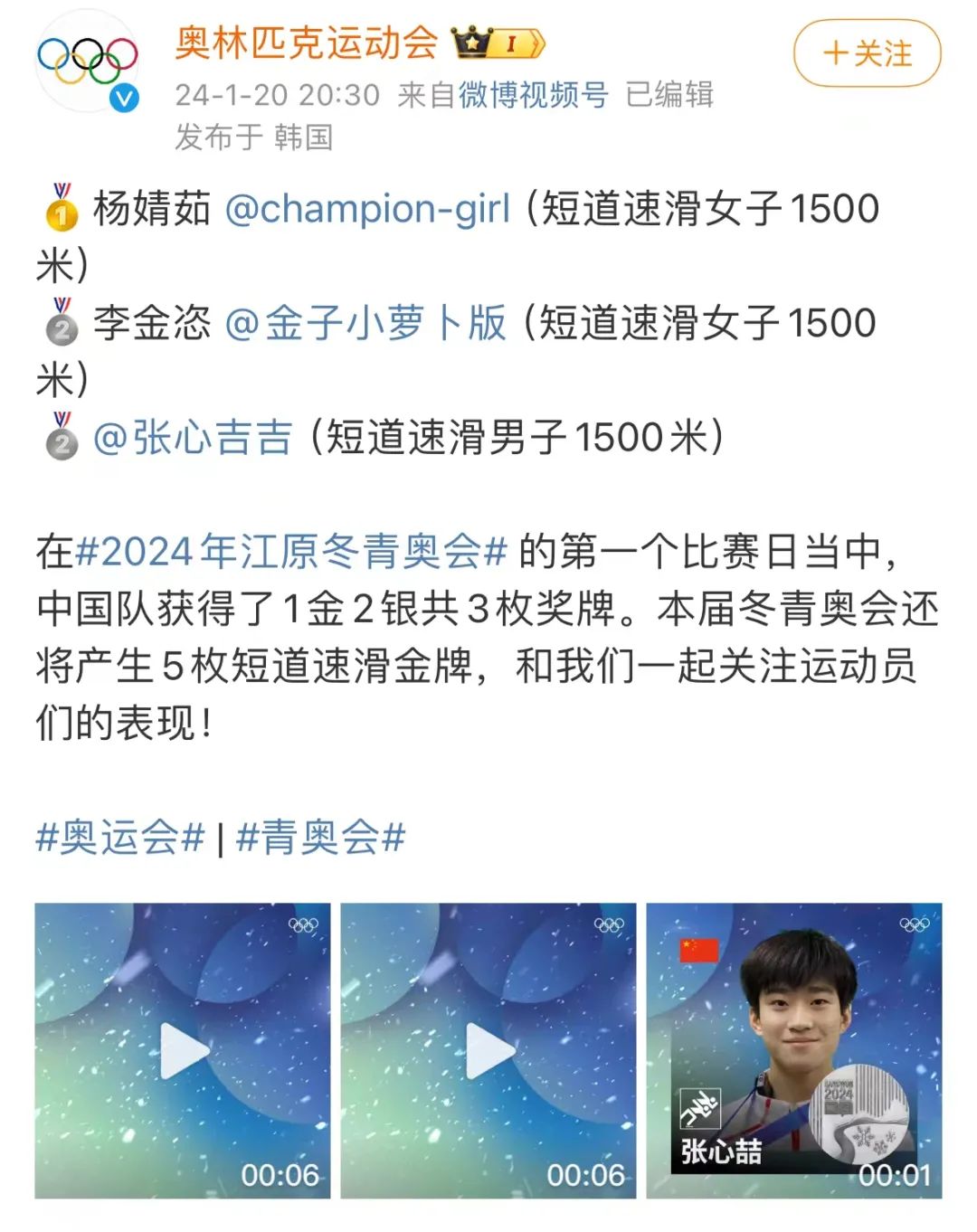 1月20日,江原道冬青奥会短道速滑女子1500米决赛,中国选手杨婧茹夺得金牌,这也是中国代表团在本届冬青奥会上获得的首枚金牌!另一位中国选手李金恣夺银。