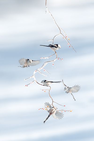 2024年1月20日,黑龙江大庆,城市森林公园,北长尾山雀在零下25度寒潮低温下,不畏严寒在雾凇中嬉戏飞舞。