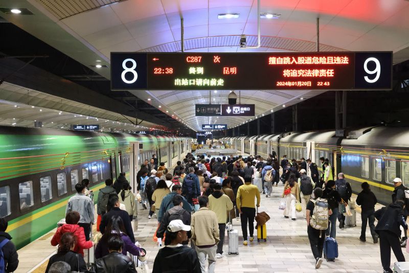 2024年1月20日,昆明,旅客在高铁站候车和乘车。随着2024年春运大幕即将开启,铁路部门积极采取加开动车组列车,增设静音车厢、检修动车、排查安全隐患等多种措施,保障铁路旅客春运高效安全出行。